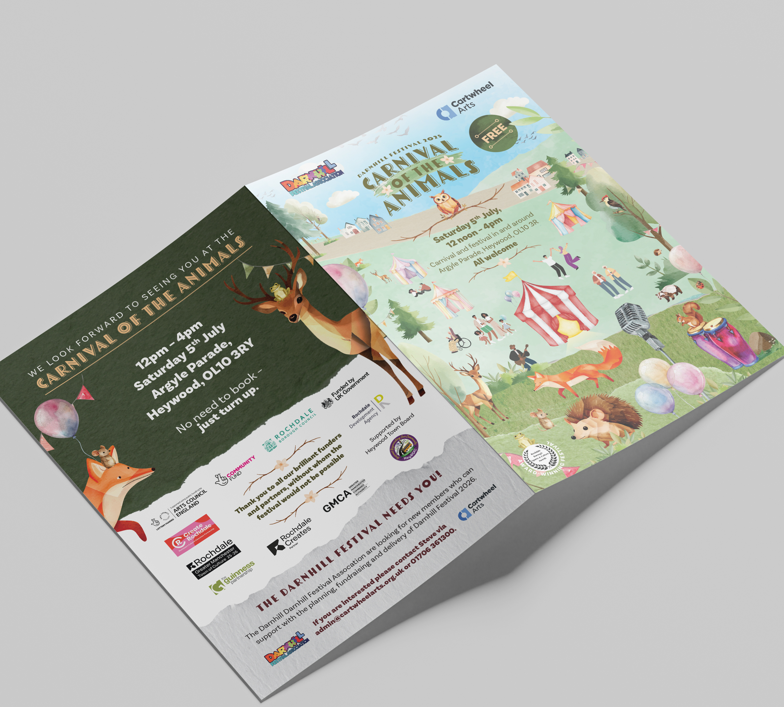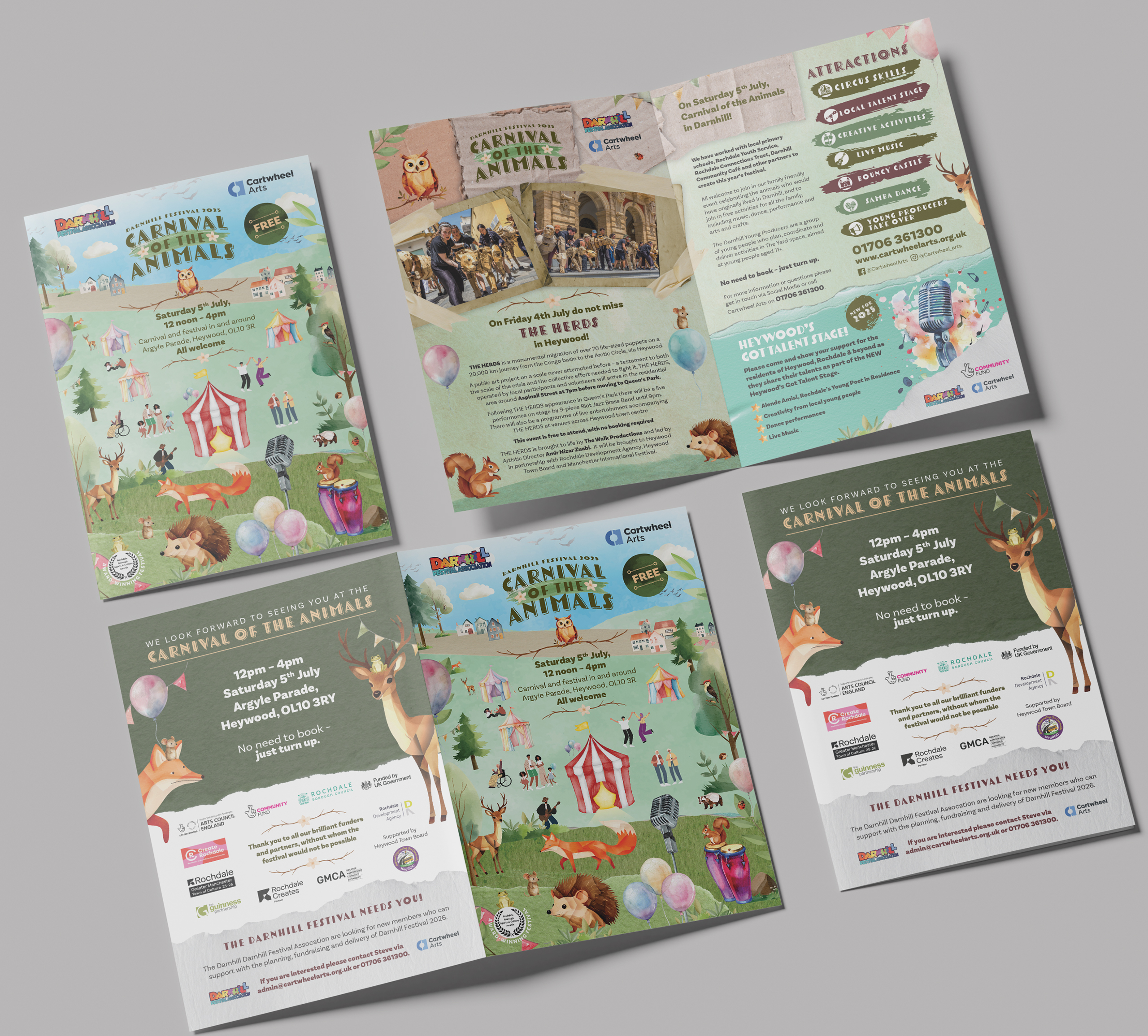 Cartwheel Arts asked me to design a folded flyer for the 2025 Darnhill Festival, themed Carnival of the Animals. The brief called for a vibrant, family-friendly aesthetic that captured the festival’s spirit while reflecting the local community — with nods to animals found around the Darnhill estate, like hedgehogs, foxes, birds, and insects.